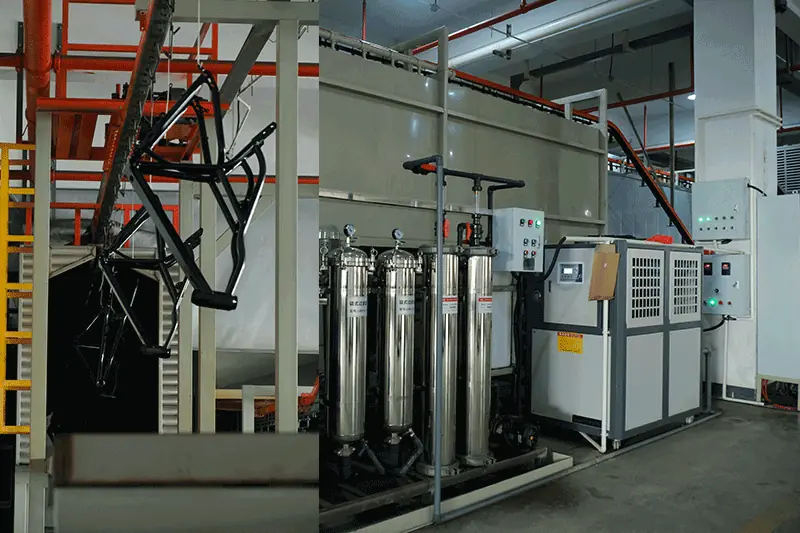 Before painting, powder coating, or anodizing, all frames undergo 11 pre-treatment steps to ensure surface cleanliness and coating adhesion. By removing oil, dust, and oxide layers through degreasing, rinsing, pickling, and phosphating, the frame surface is activated and prepared for coating. This process improves adhesion, prevents corrosion, and ensures a smooth, uniform finish. Proper pre-treatment is essential for long-lasting durability and premium surface quality.