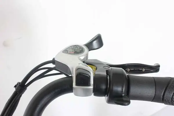 Right handlebar with thumb throttle, gear shifter, and brake lever for easy control.