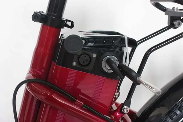 Removable lithium battery with dependable energy output. Charges easily and locks into the frame for safety.