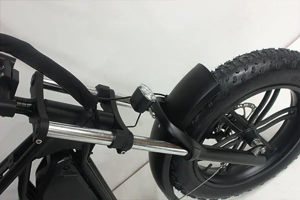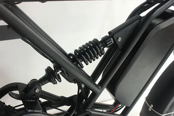 Its rear suspension and fat tires provide great shock absorption, while the integrated rim design enhances durability and visual appeal.