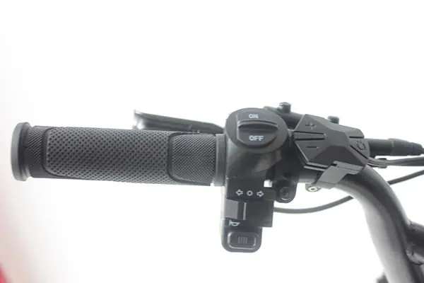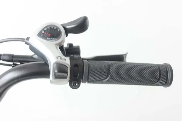 Right handlebar with thumb throttle, gear shifter, and brake lever for easy control.