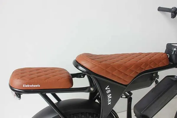 Extended seat supports rider + passenger for commuting or shared trips.
