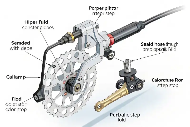It’s actually a simple and powerful system based on fluid pressure4. When you squeeze the brake lever, you push a piston that forces hydraulic fluid5 through a sealed hose. This fluid pushes pistons inside the caliper, which then clamp the brake pads onto a disc rotor, stopping your wheel.